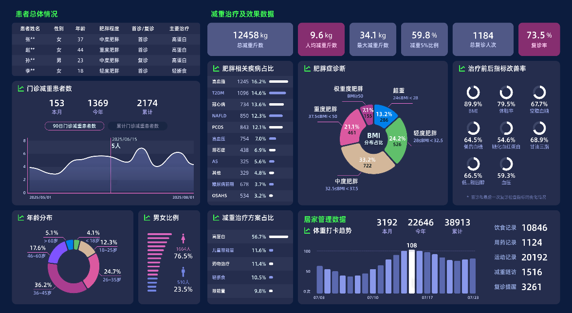 「减重患者依从性大幅提升」体重打卡频次从人均3天/月跃升至15天/月(提升400%),减重患者3次以上门诊复诊率从23%提升至52%(提升超过120%)。